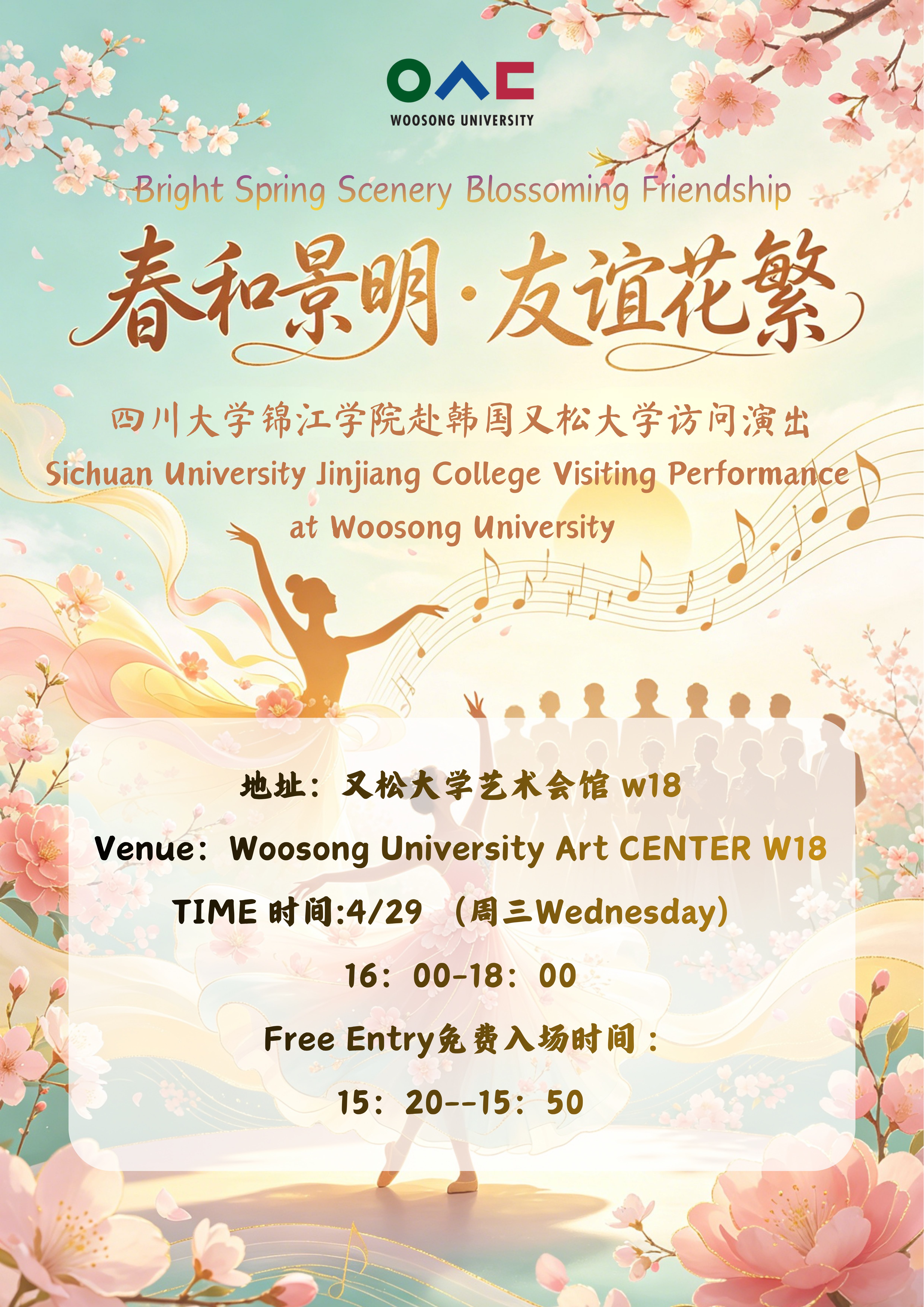 Woosong University is hosting a special visiting performance by students from Sichuan University Jinjiang College, celebrating the theme “Blossoming Friendship” — a blend of culture, music, and artistic expression that brings people together beyond language and borders.