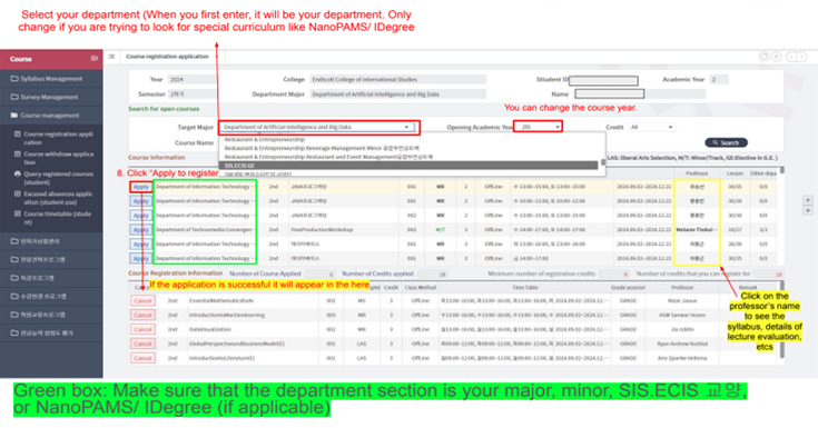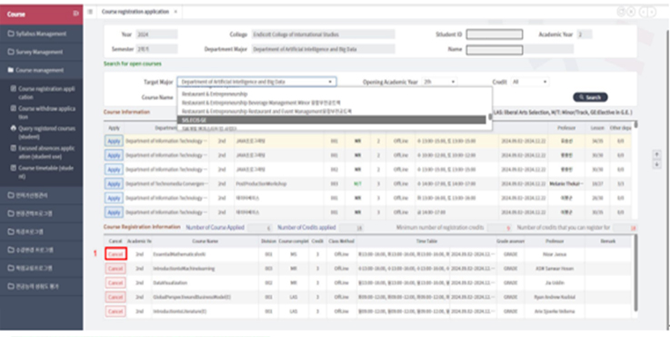 Students can withdraw from the course before the 2/3 of course if students get professor’s and advisor’s approval and ensure that the remaining credits are no less than the minimum required credits of 9 (summer/winter semester is 3 credits).